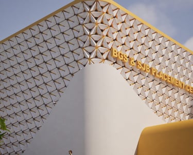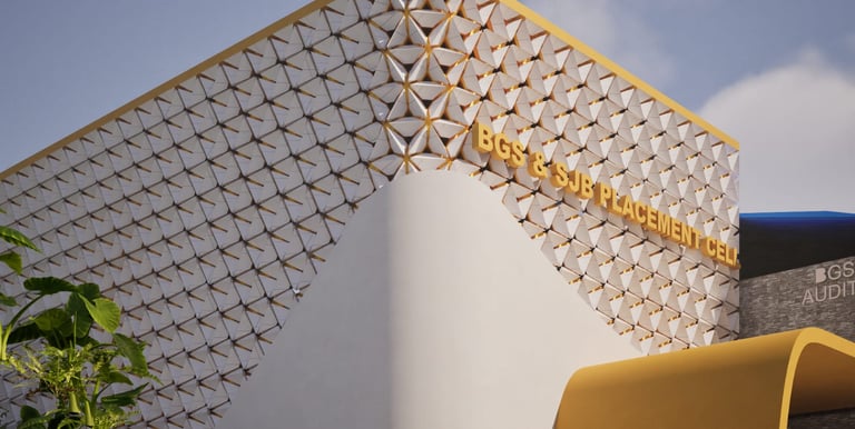 The façade system developed for BGS College focuses on creating a breathable architectural envelope suited for an educational campus. Modular façade elements introduce controlled light and airflow while maintaining a strong visual identity for the institution. The system integrates functional shading with a rhythmic architectural language that complements the scale of the campus buildings.